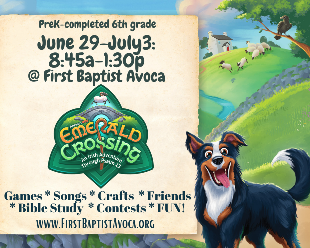 5 days of fantastic, free, fun, Monday 6/29 – Friday 7/3, daily from 8:45 a.m. – 1:30 p.m. at First Baptist Church for kids from Pre-Kindergarten to completed 6th grade (2025-2026 school year). Because of the longer time, we will serve a free lunch! Please be sure to include any dietary allergies on the registration form.